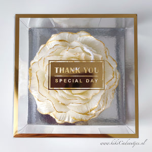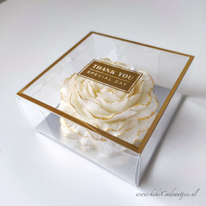 Breng tijdloze elegantie in huis met deze handgemaakte bloemenkaars in de vorm van een witte ranonkel, verfijnd met gouden accenten.