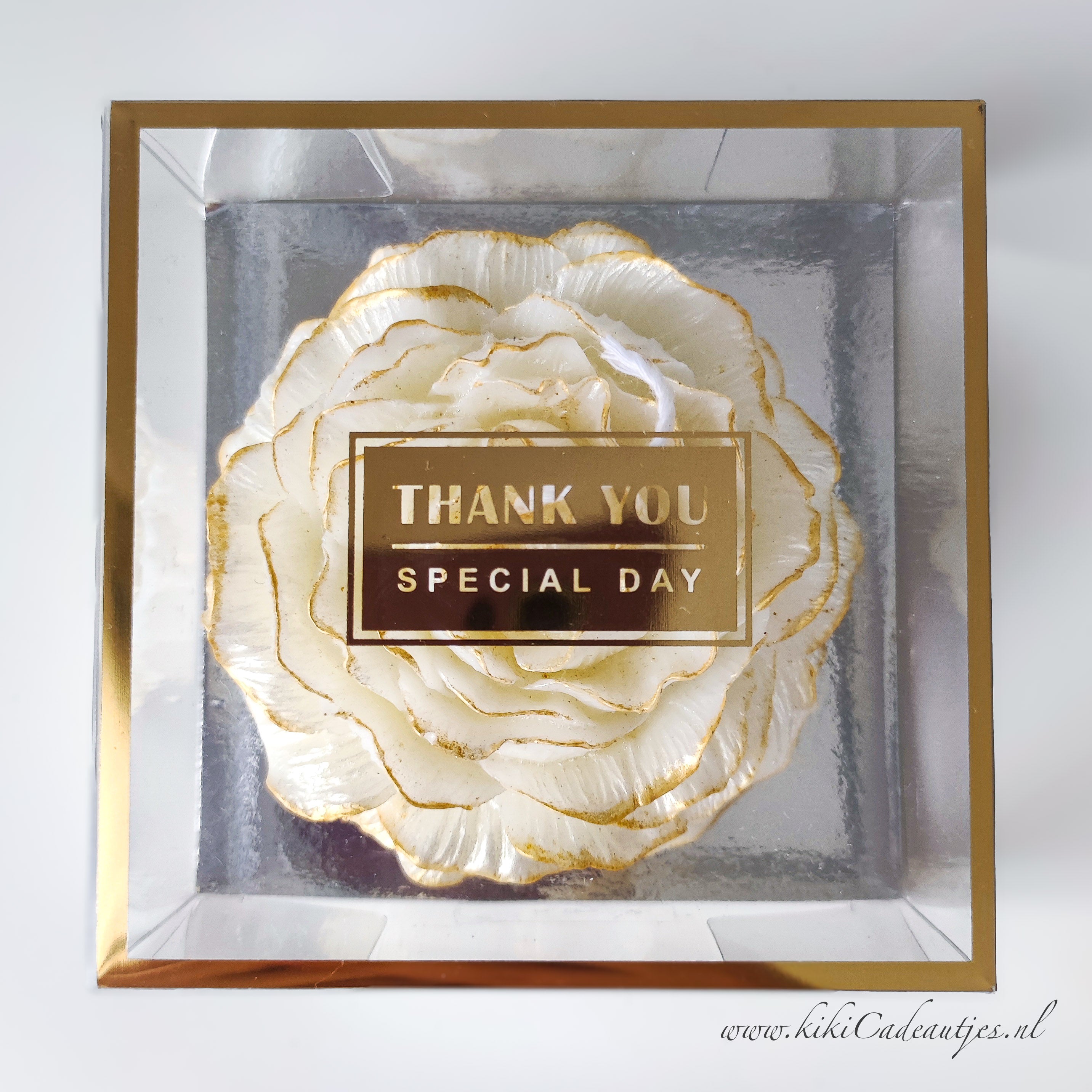 De realistische bloemblaadjes en het goudkleurige randje maken deze kaars tot een echte blikvanger.